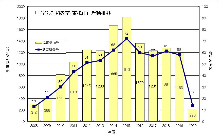 子ども理科教室・東松山は、2008年に活動を開始し、年々教室開催の要請があり下記の表およびグラフに示すような右肩上がりの活動推移となりました。しかしながら、2020年コロナ感染症のため十分な活動はできませんでした。